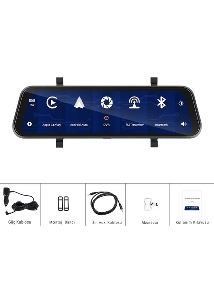 9.66” Akıllı Dikiz Aynası – Kablosuz CarPlay & Android Auto, 1080p Ön/Arka Kamera, IPS Dokunmatik
